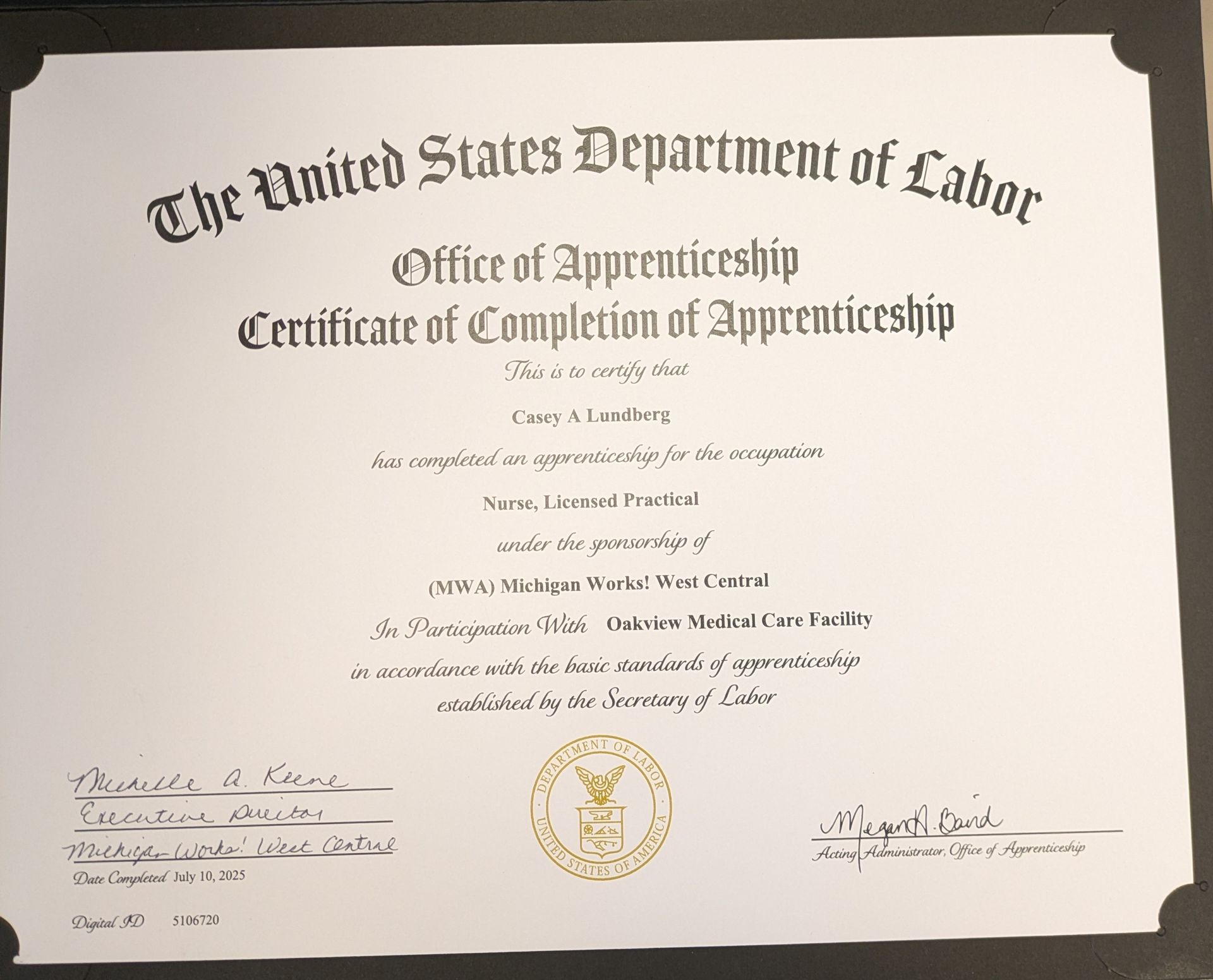 Casey completed her on-the-job training and in-classroom instruction to receive her official apprenticeship certificate from the U.S. Department of Labor in July 2025. Michigan Works! West Central holds the apprenticeship standards under which Oakview created the course outline. Casey is the first apprentice to complete their training program under Michigan Works! West Central's standards.